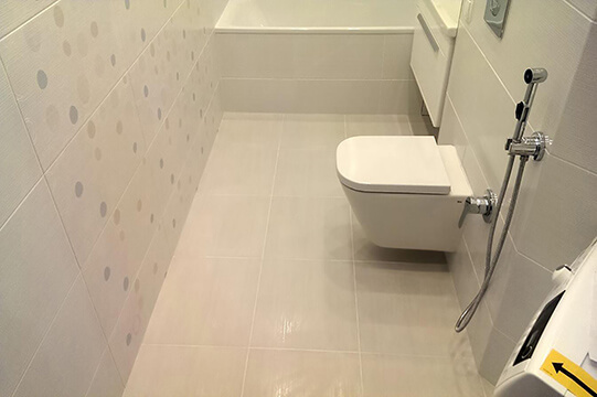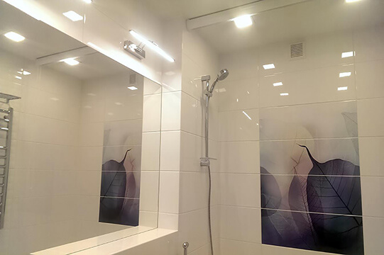 На втором этапе выполняется установка новых водопроводных и канализационных коммуникаций, выравнивание поверхностей комнаты и их отделка материалами, которые выбрал непосредственно клиент. Обычно для потолка используется виниловая пленка (натяжные потолки) либо ПВХ-панели, а для стен плитка (керамическая/кафельная) либо мозаика.